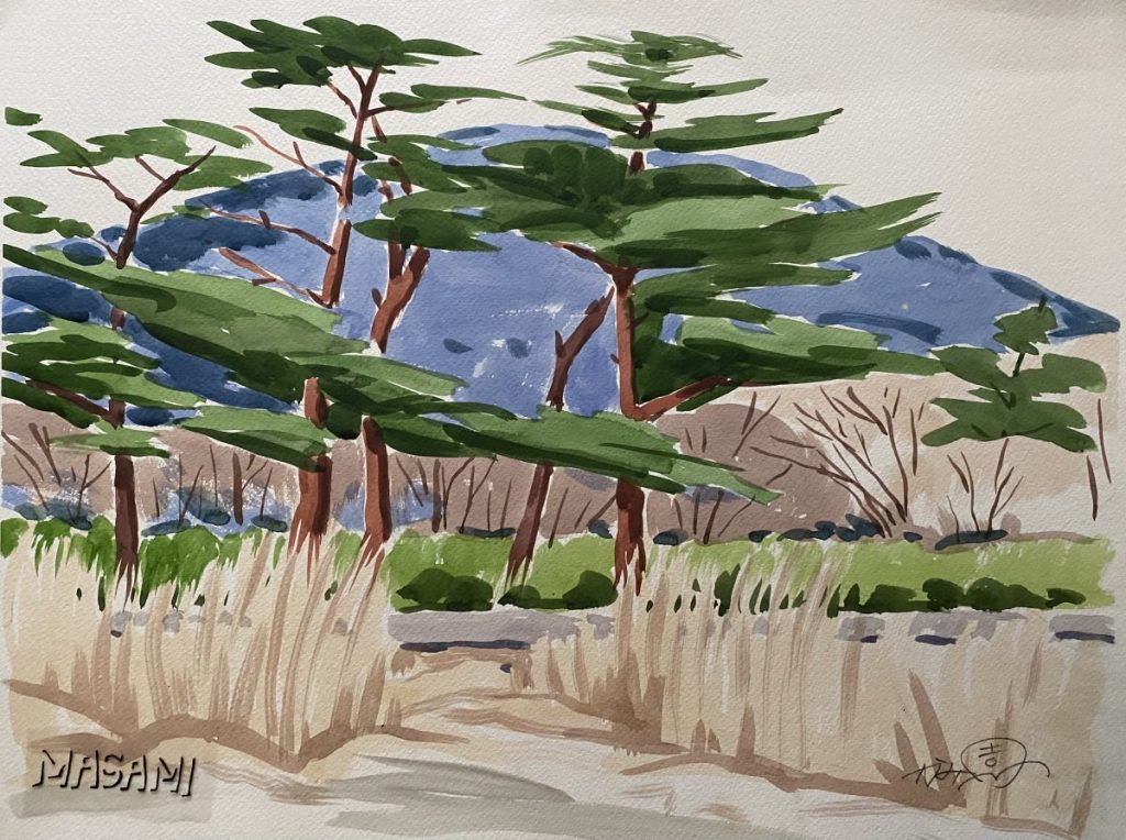 ※お目汚しになりますが、作品に孫の書いた影文字で「MASAMIスケール」(縦横2×8センチ)をのせています。作品の大きさの目安になれば幸いです。