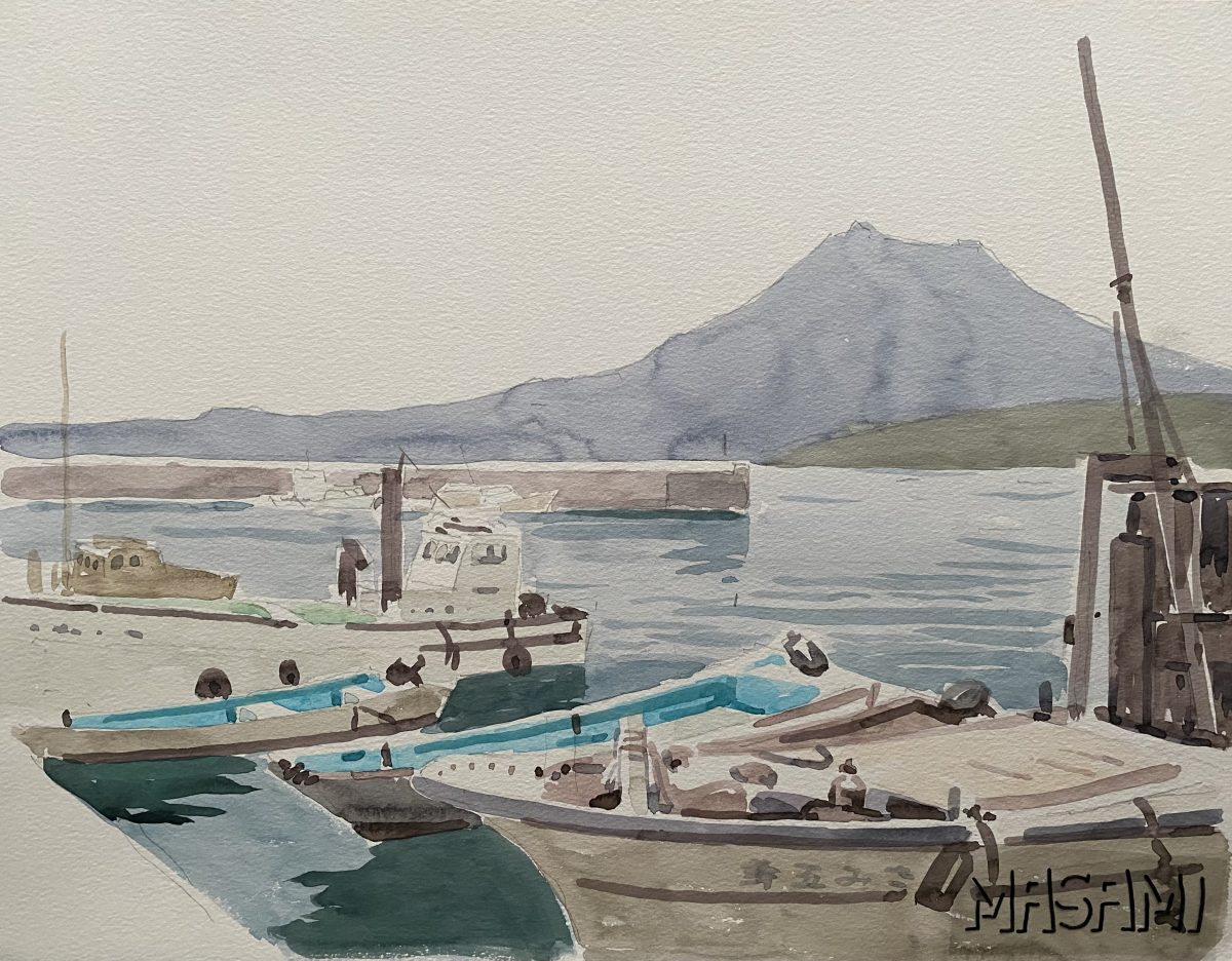漁港と桜島