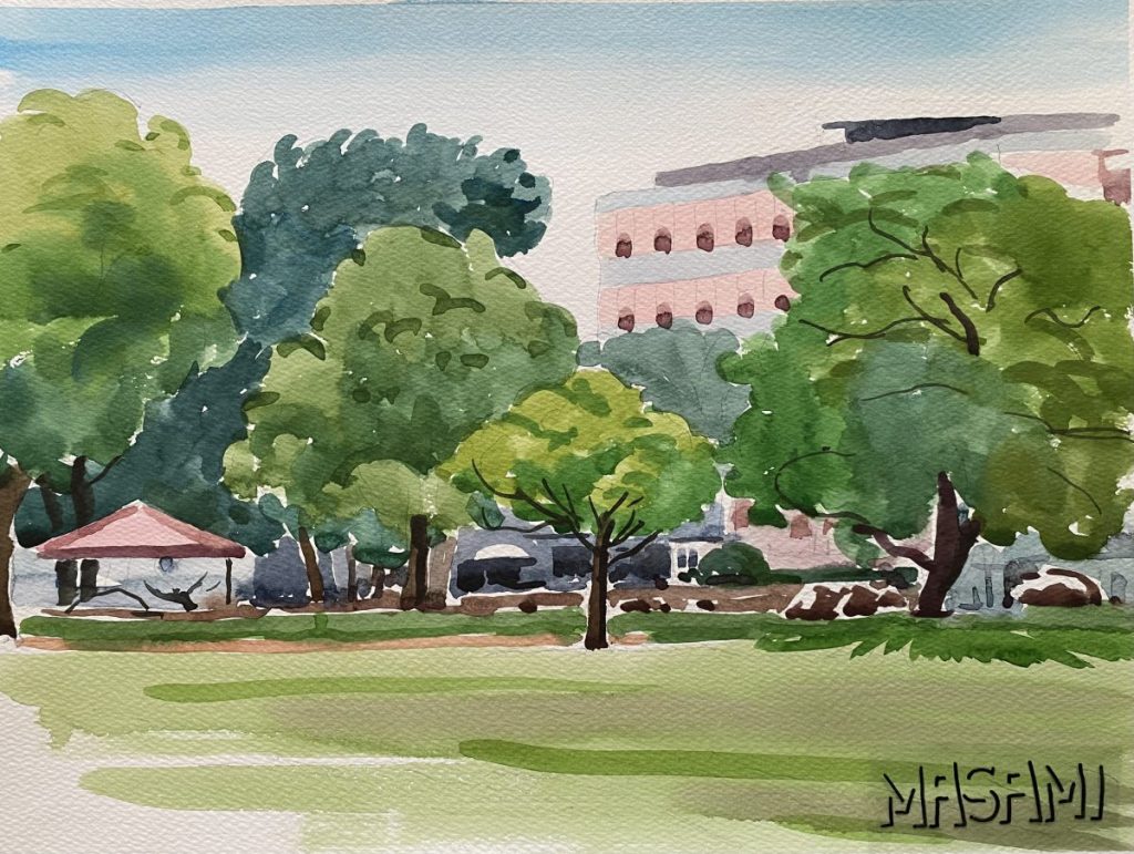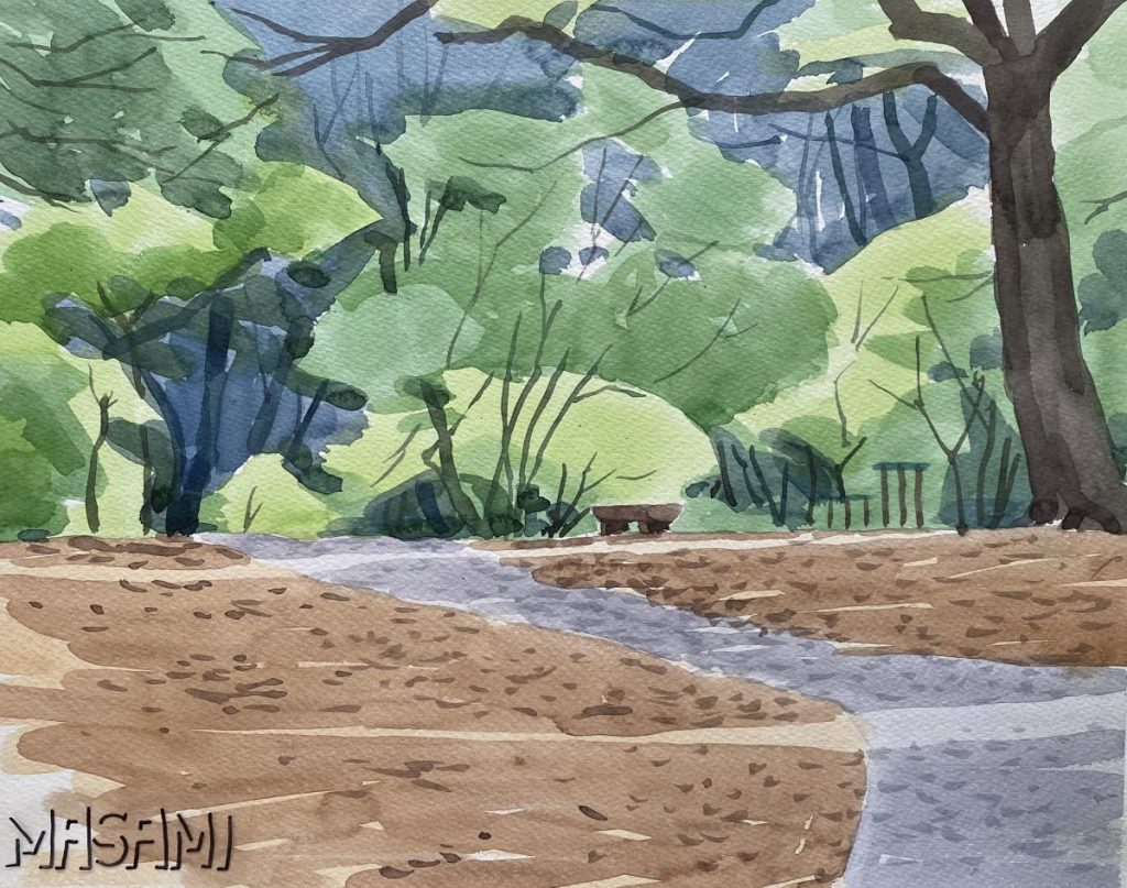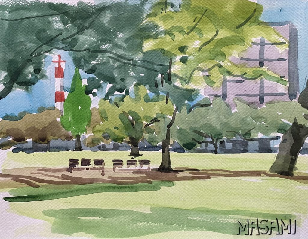 急な天候の変化や日除け対策として東屋をスケッチ場所の選定基準としていたのだとは思いますが、東屋がそこにあるだけで、その一帯はなんとなくホッとする気がします。