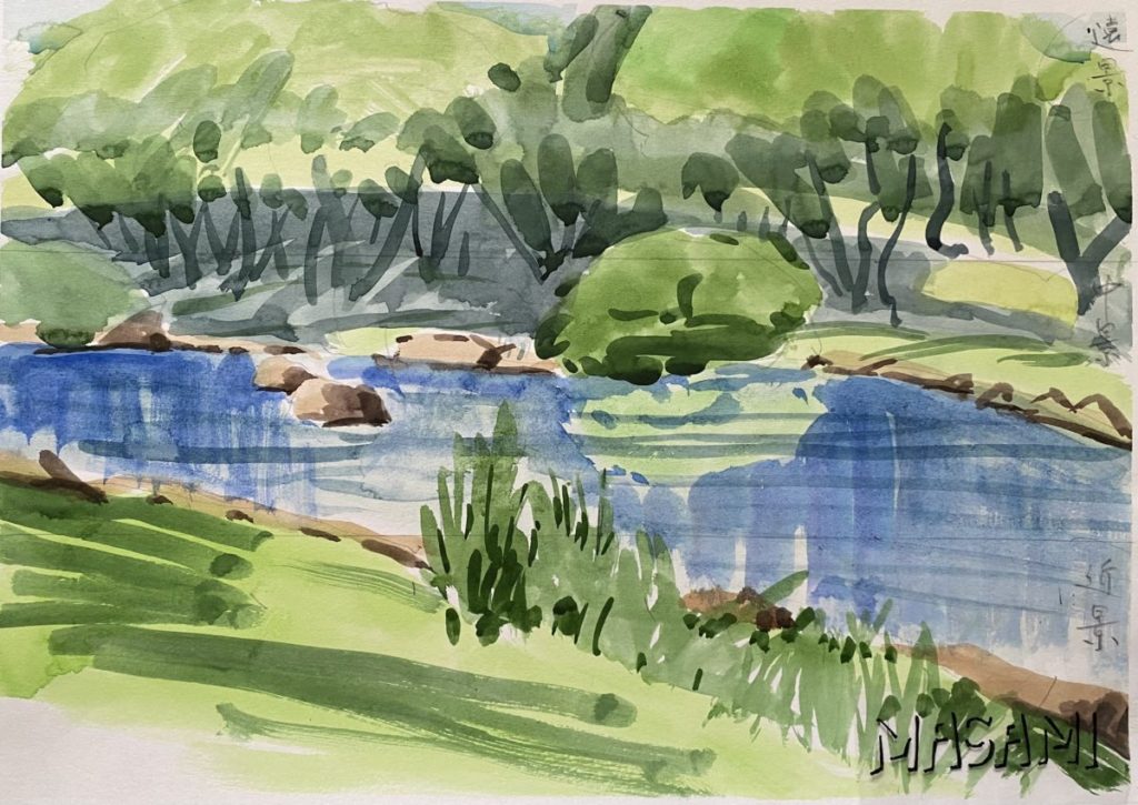 ※お目汚しになりますが、作品に孫の書いた影文字で「MASAMIスケール」(縦横2×8センチ)をのせています。作品の大きさの目安になれば幸いです。