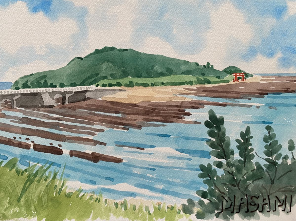 父の描いた青島の絵はいくつかありますが、いつも鬼の洗濯板が描かれています。