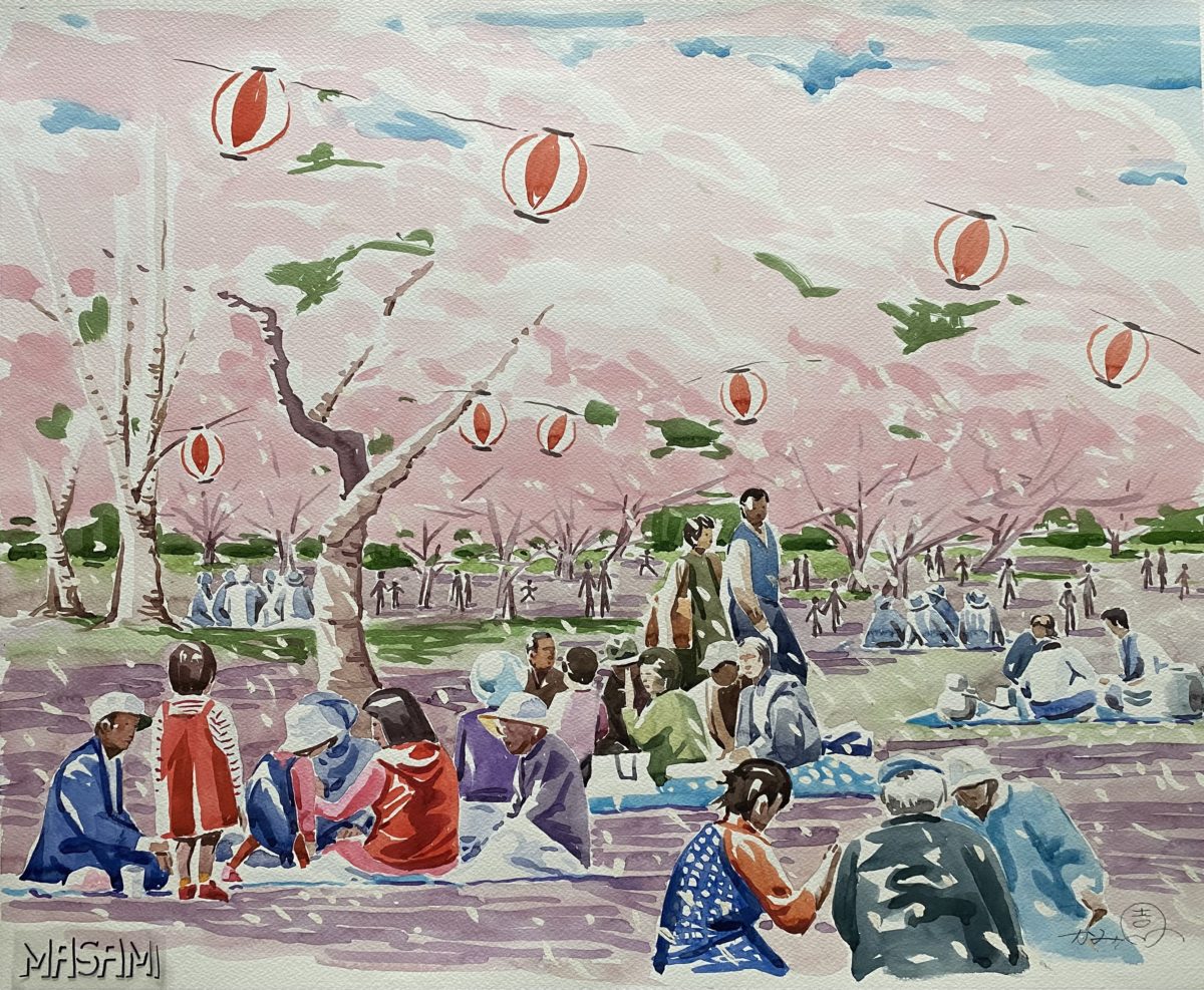 今回は、非常に思い入れの深い作品を展示予定です。それは、満開の桜を描いたお花見の風景「春の宴」です。