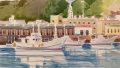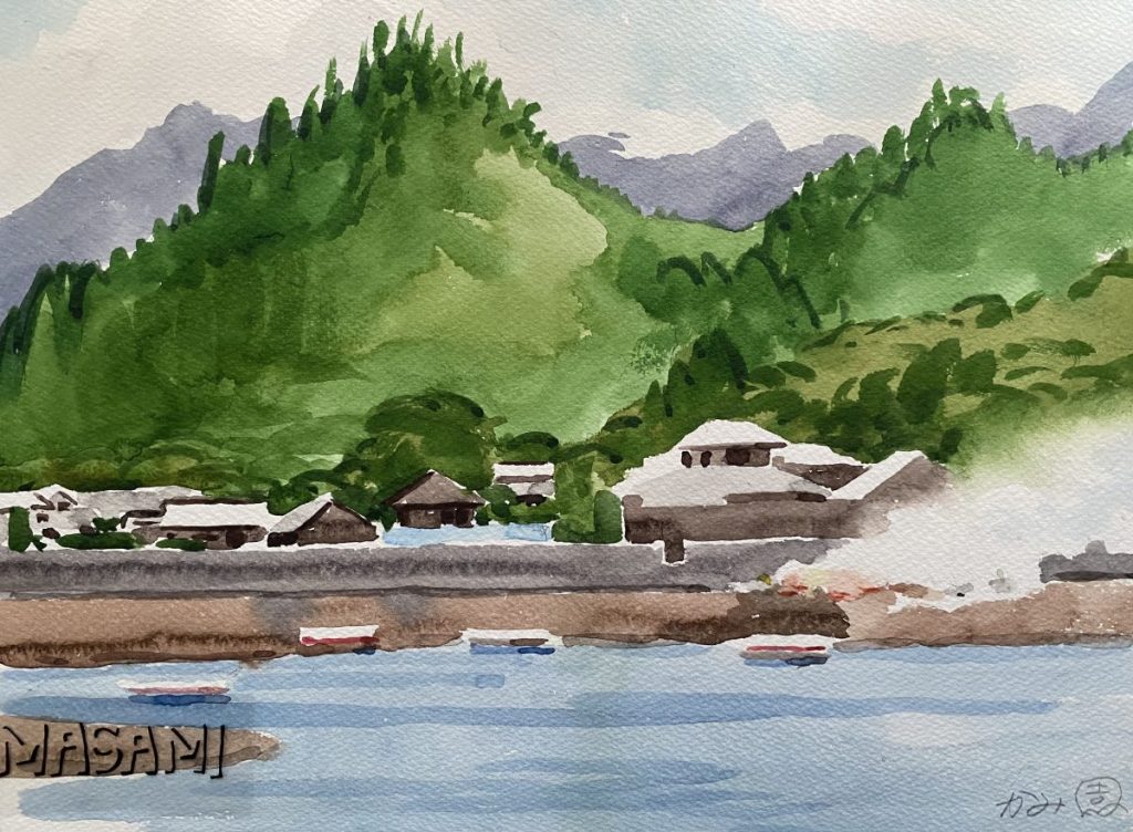 しかし、時には集落が広がる静かな海辺の風景を描いた絵もあります。
