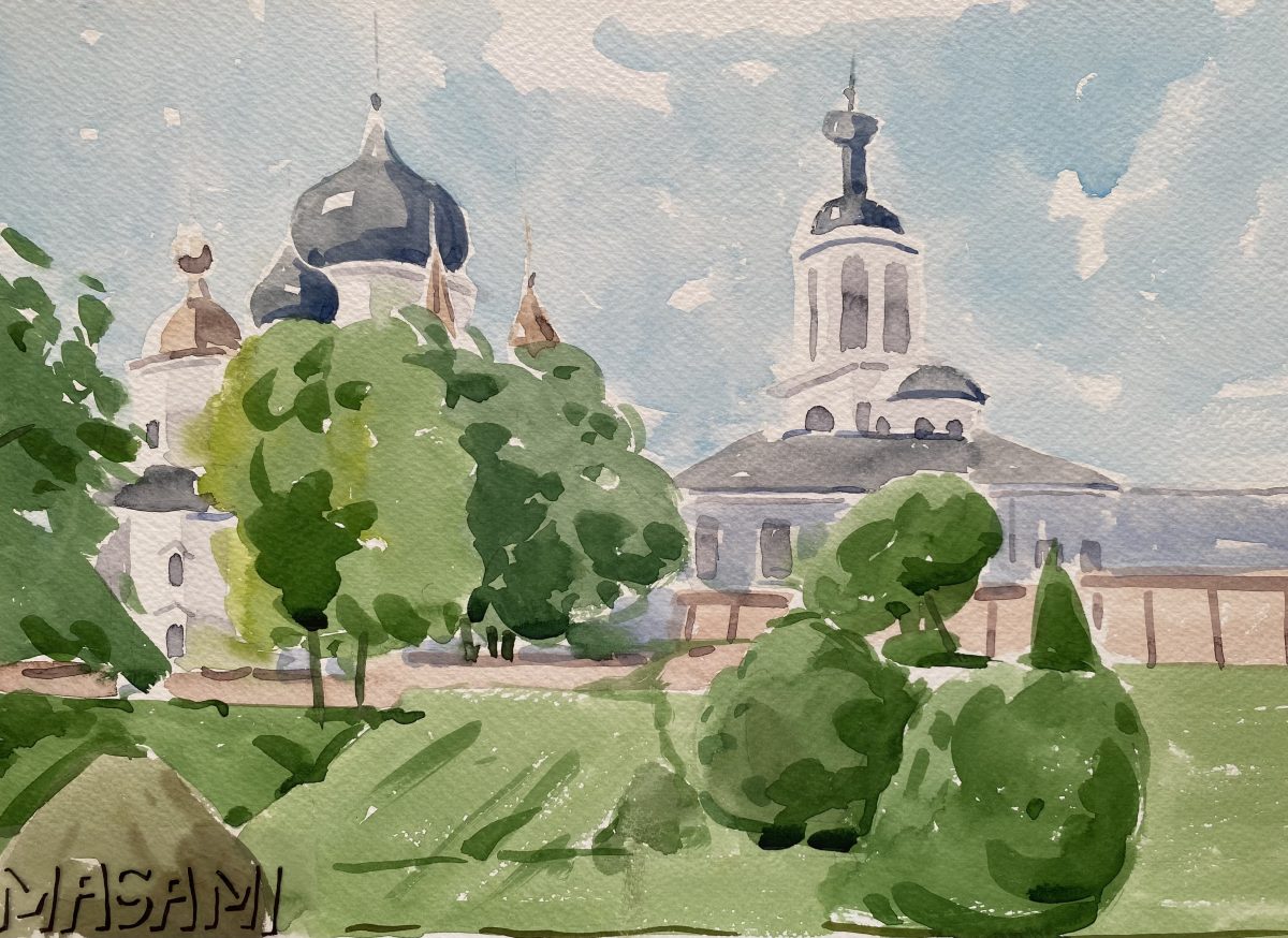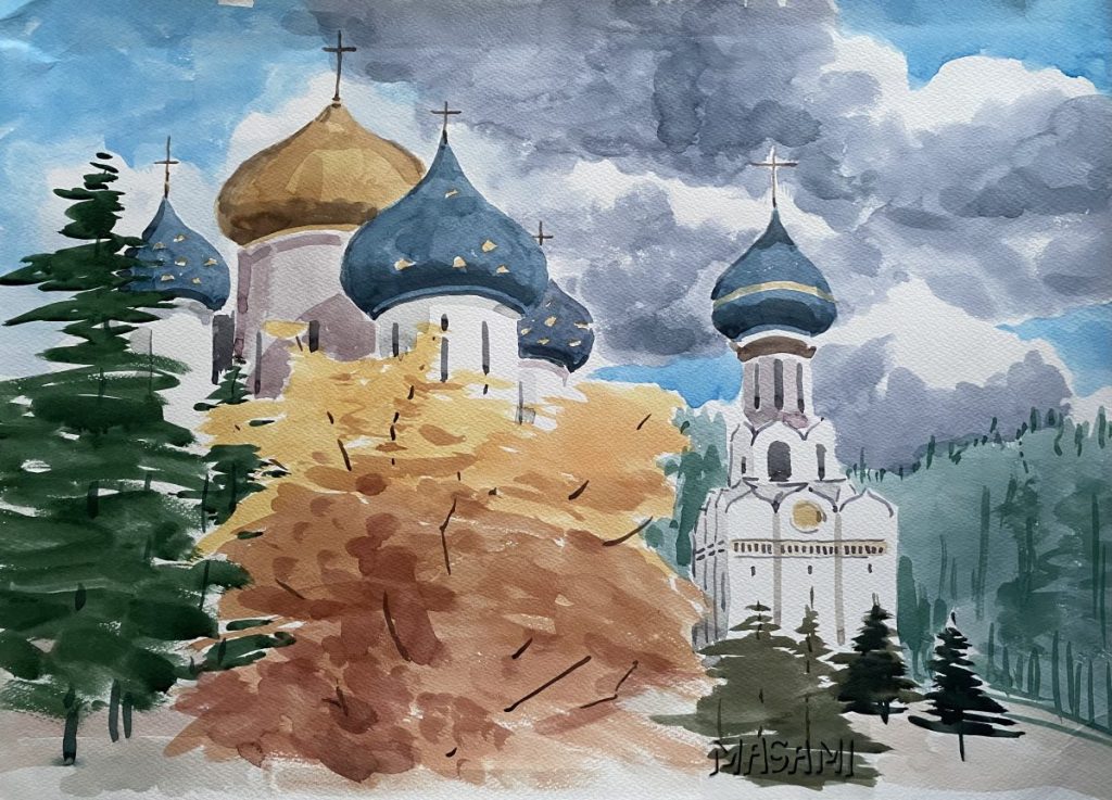 この絵に描かれている場所はロシア、モスクワ郊外のスーズダリ、私が30年以上前に行って写真を撮り、父にモチーフとしてその写真を渡した地域です。