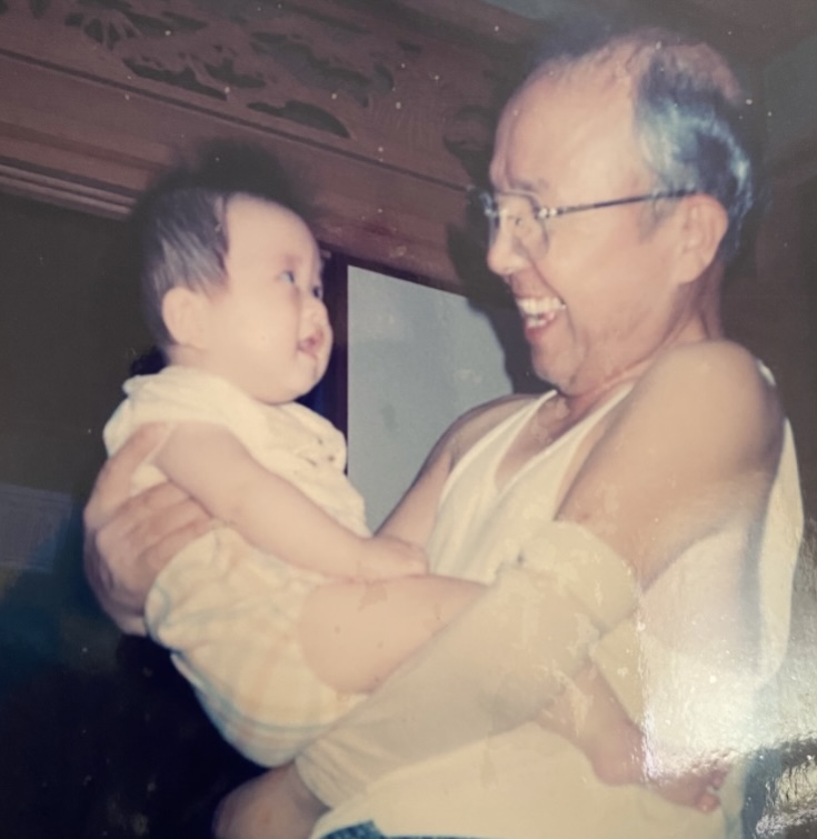 片腕で孫を抱きかかえる父(左腕は義手)