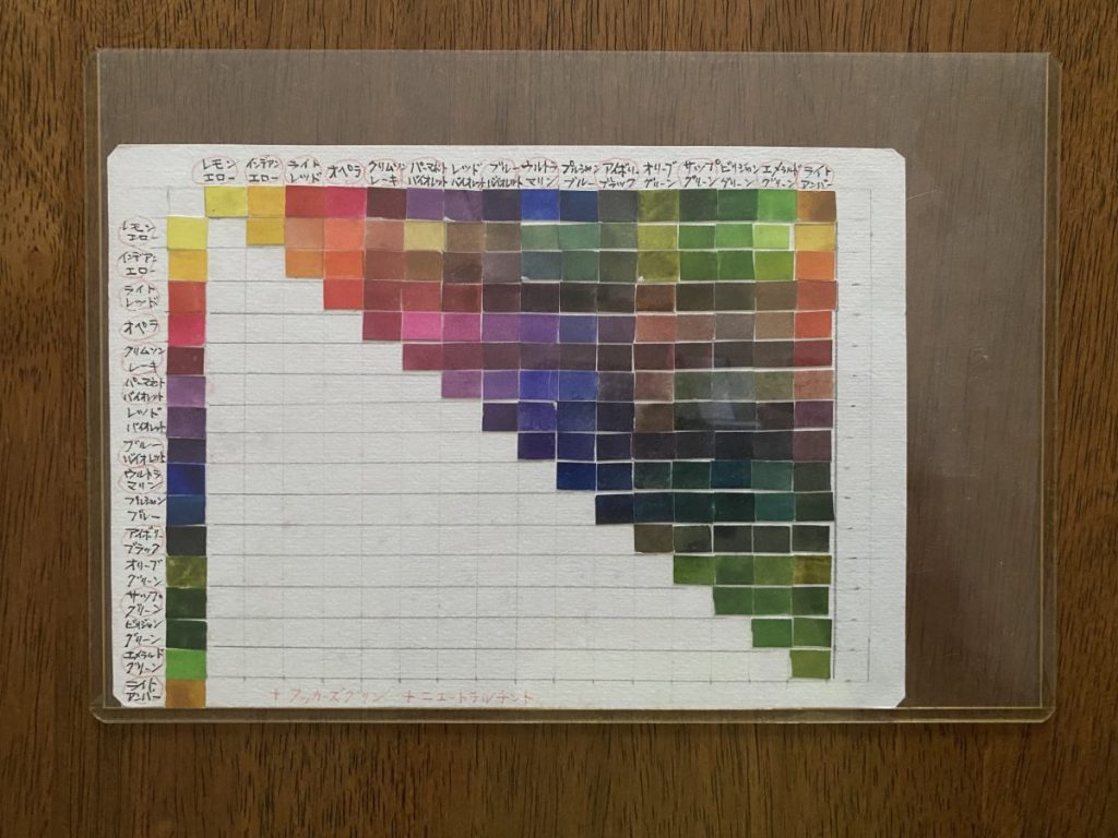 はがきサイズ位の用紙に、色の組み合わせや、光源からできる影の付け方と思われる資料が透明ケースに入れられています。