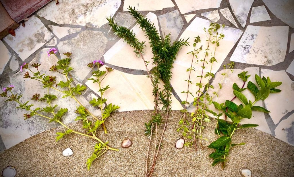 今回摘んだのは、ローズゼラニウム、ローズマリー、スィートマージョラムマリー、そしてペパーミント