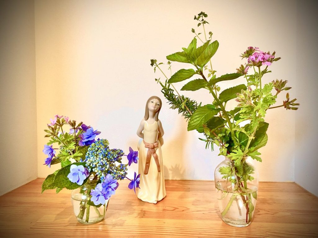 庭のハーブを何種類か摘んで花瓶にいけたら気分は一気に爽快に♪