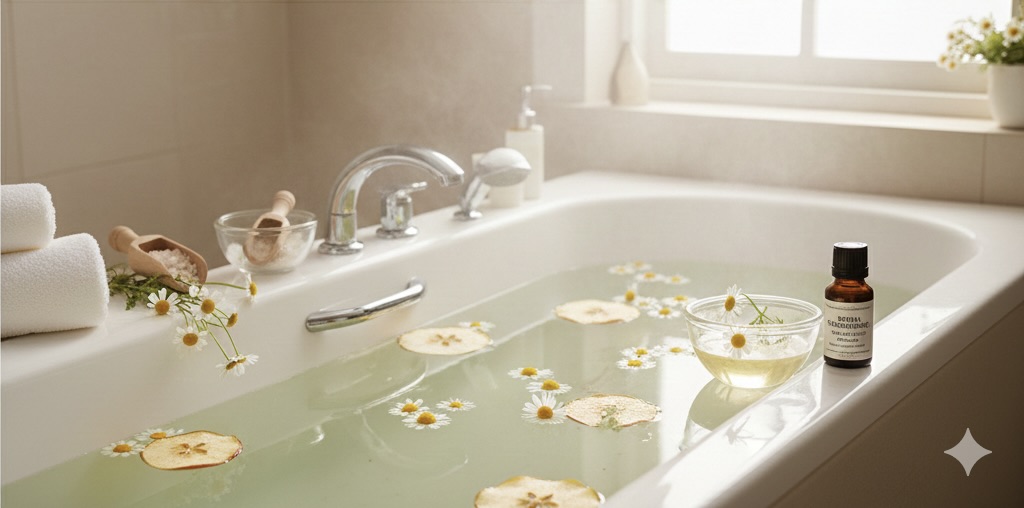 お風呂に浸かる前に、バスソルトなどにローマンカモミール精油を2~3滴混ぜてから浴槽に入れます。湯気と共に広がる甘い香りが、心身の疲れを洗い流し、深い休息をもたらしてくれるでしょう。